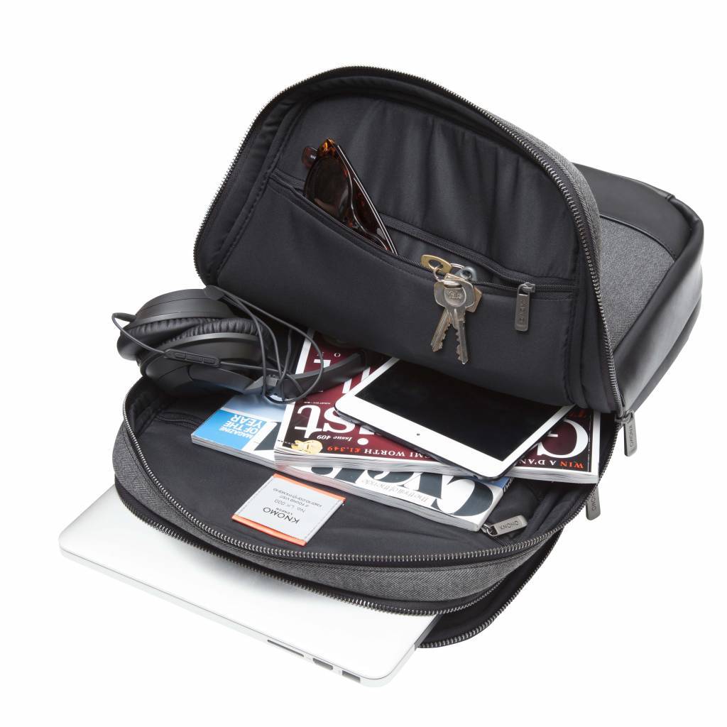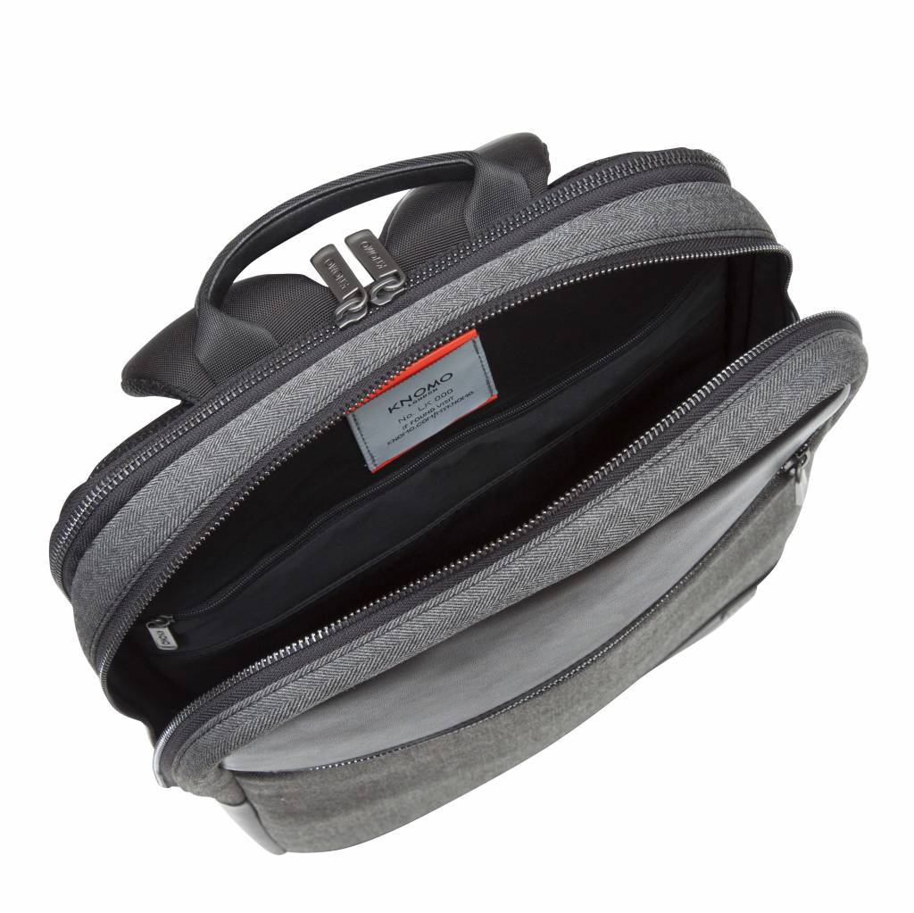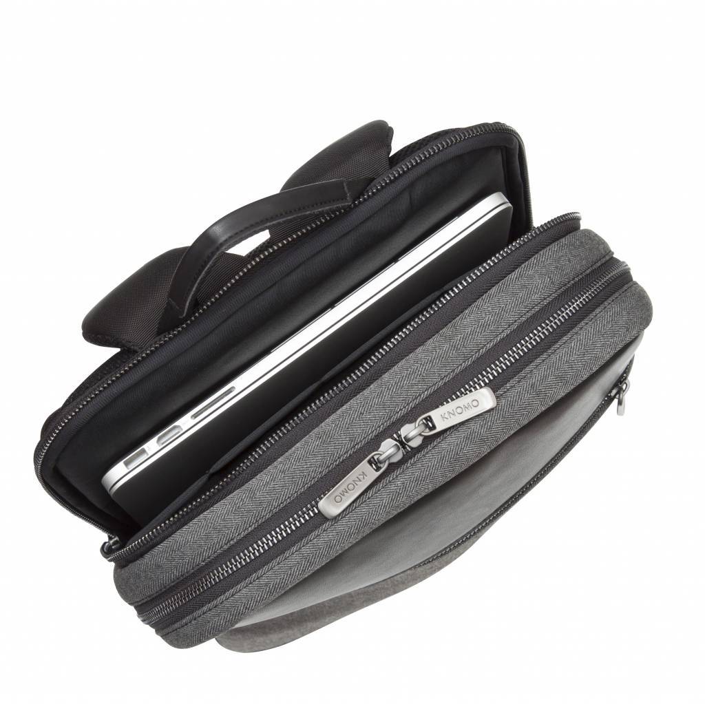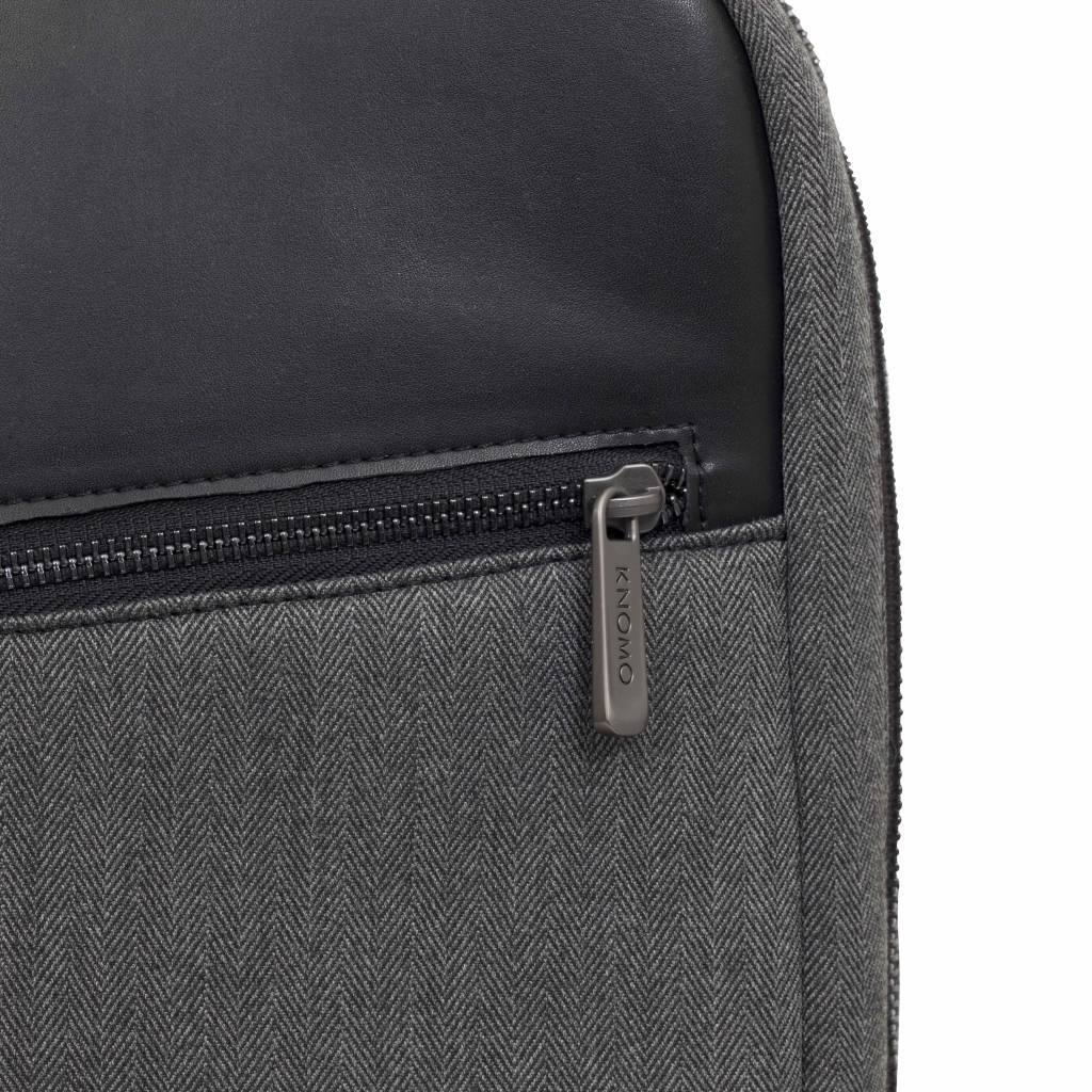 De Knomo Southampton 15 inch rugzak is een lichtgewicht rugzak voor je MacBook. In deze Knomo rugzak kun je elke MacBook tot 15,4 inch kwijt. De Knomo Southampton backpack is gemaakt van duurzaam polyester in een visgraat motief - wat er natuurlijk ook mooi uit ziet. - gecombineerd met leer. Qua inhoud heeft de Knomo Southampton rugzak twee ritsen: een voor het vak voor je MacBook en daarvoor een vak met diverse vakjes die je kunt afsluiten met een rits voor de rest van je spullen, kabels, opladers en dergelijk. Ook op de voorkant zit een ritsvak met ruimte voor bijvoorbeeld je knip of iPhone. Een goede rugzak geeft goede steun en ook een prettig comfort: dat zal bij de Knomo niet anders zijn. Door de brede gepadde schouderbanden zit de tas goed op je rug gecombineerd met de Air Mesh achterkant. Naast schouderbanden heeft deze tas ook een handvat voor als je ‘m in de hand wilt dragen.