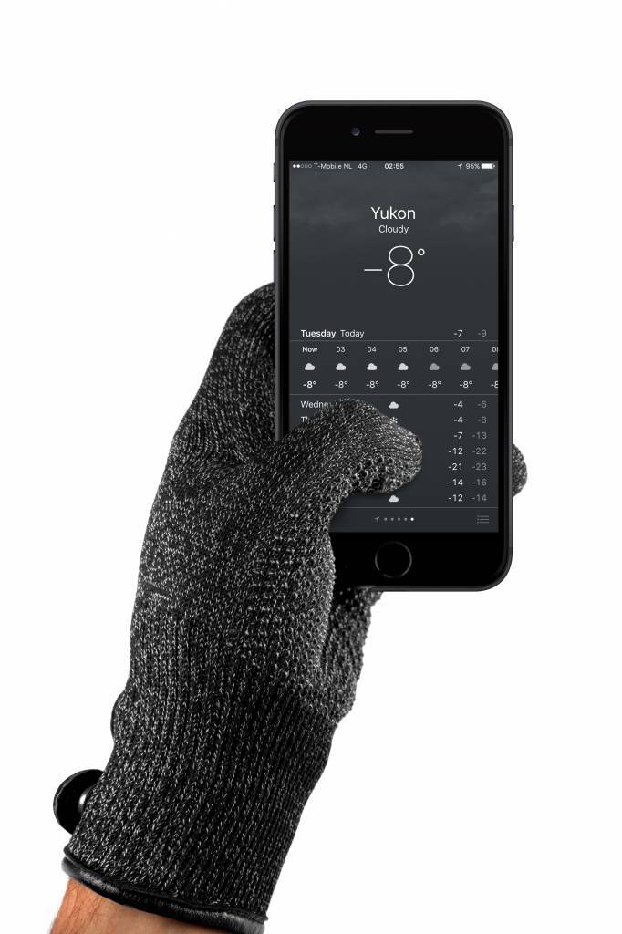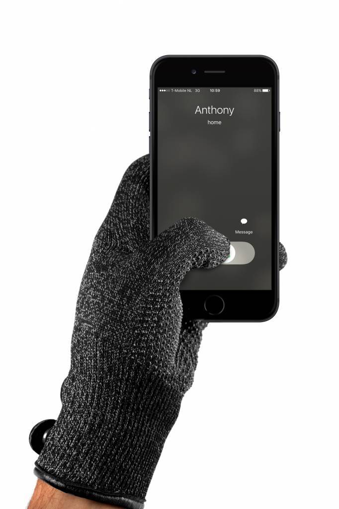Deze Double-Layered Touchscreen handschoenen zijn speciaal ontworpen zodat je zonder koude handen te krijgen je iPhone, Galaxy of andere smartphone of tablet kunt bedienen. De handschoenen zijn prachtig vormgegeven, waarbij gebruik is gemaakt van uitlstuitend premium materialen. Het lederen bandje bij de pols is voorzien van een magnetische sluiting en is net als de leren rand rondom de pols in bijpassend zwart. In de handpalm is een patroon van kleine siliconen balletjes verwerkt, wat veel extra grip geeft. De Double-Layered Touchscreen handschoenen zijn naast een geintegreerde zachte fleece laag ook voorzien van een extra wollen voering. Dit maakt de handschoenen naast comfortabel nog beter bestand tegen de koudste weersomstandigheden. Hoe werk het? Om de handschoenen 'competible' met touchscreens te maken zijn er hoge kwaliteit silver coated nylon vesels in de stof verwerkt. Hierdoor reageert het scherm op aanraking van de handschoenen.