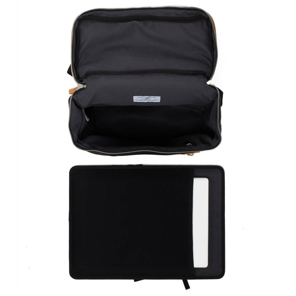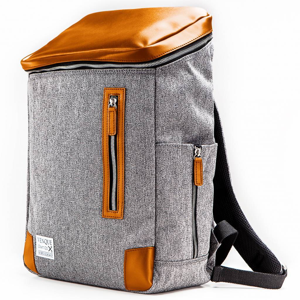 De rugzak is gemaakt van 'Quanta Fabric'. Dit is een speciaal door Venque ontwikkelde stof. De eigenschappen van deze mooie en rijke stof is dat het naast water en vuil afstotend ook nog eens erg stevig en krasbestendig is. Daarnaast is de rugzak afgewerkt met hoogwaardig premium leer. Het leer krijgt naarmate de tas gebruikt wordt meer karakter (de kleur van het leer bij aankoop is lichter dan op de foto, zie YouTube filmpje op pagina van Venque Hamptons voor actuele kleur). Aan de binnenkant is de rugzak voorzien van een mooi afgewerkte luxe voering.